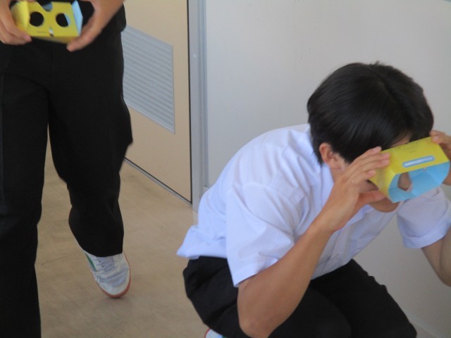 3年生の家庭科の授業では、「幼児」について学習を進めています。今日は、幼児の視界を体験するために、厚紙でできた双眼鏡のようなキットを組み立て、実際に装着して歩いてみました。両側の視界が狭くなり、とても見えにくい様子でした。体験を通して、幼児の気持ちを理解することにつながりました。