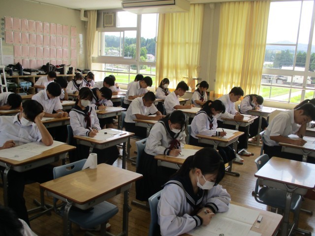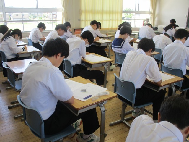3年生は2日目の実力テストに取り組みました。教室には張りつめた緊張感が漂っていました。生徒たちは最後まで集中して問題に向かっていました。