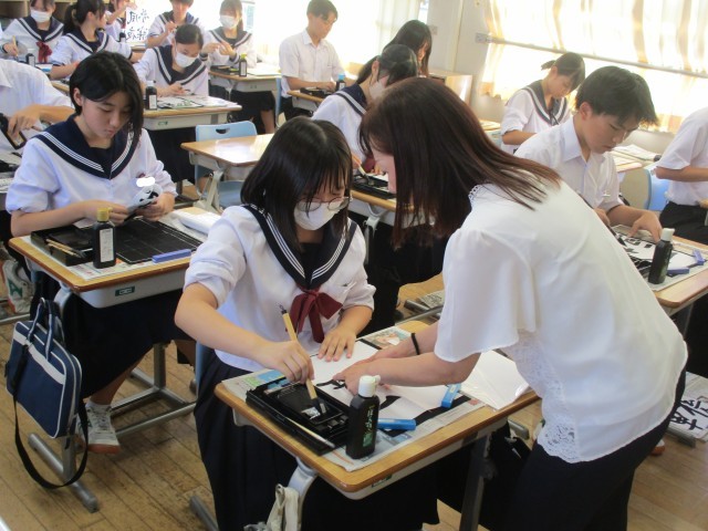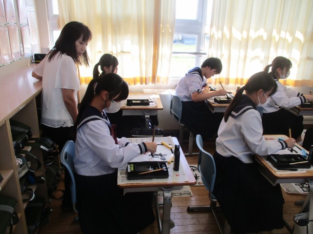 3年生の国語科の授業では、習字で行書の学習に取り組んでいます。昨日の1年生と同じ講師の先生からご指導をいただきました。今回の課題は『全て細くならない』『書き順が大事』です。3年生は、自分で選んだ四字熟語に挑戦し、講師の先生のアドバイスを受けながら、真剣な表情で筆を運んでいました。