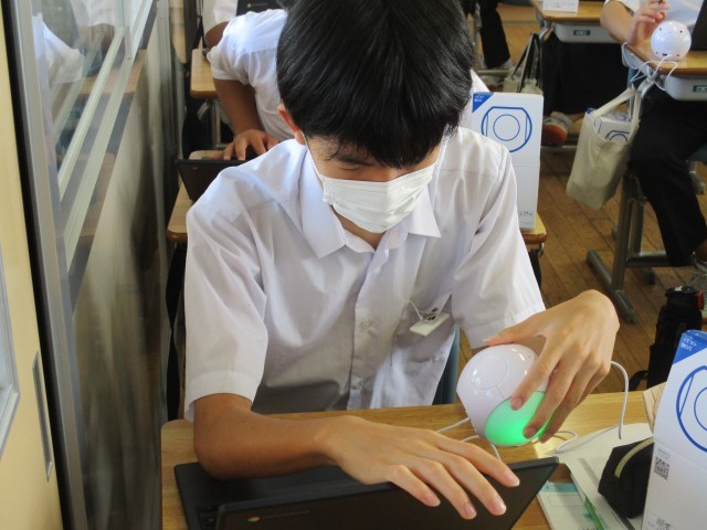 3年生の技術科の授業です。プログラミング学習用の教材キットを完成させ、タブレットにつないでプログラミング学習を行いました。今日は、信号機のように赤・青・黄の順に時間ごとに点滅させる課題に取り組みました。難しい部分は、友達や先生からアドバイスをもらいながら進め、命令通りに点滅したときには、生徒はとてもうれしそうな表情を見せていました。
