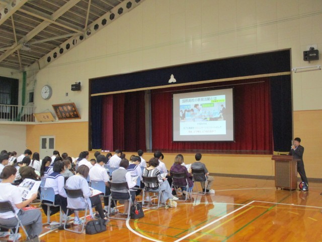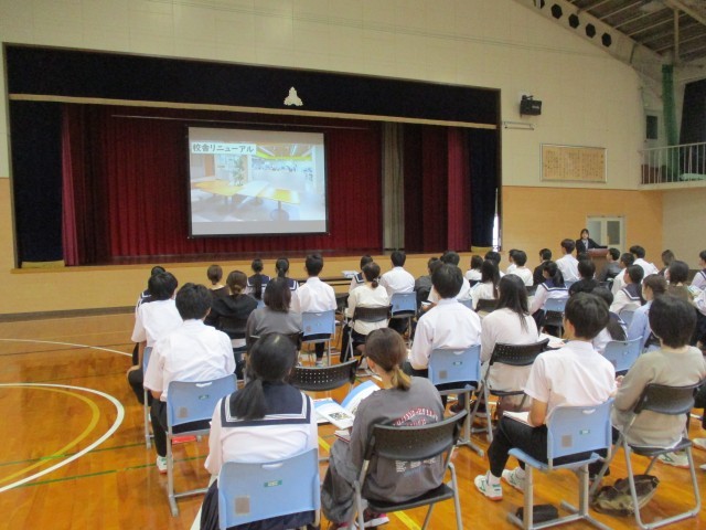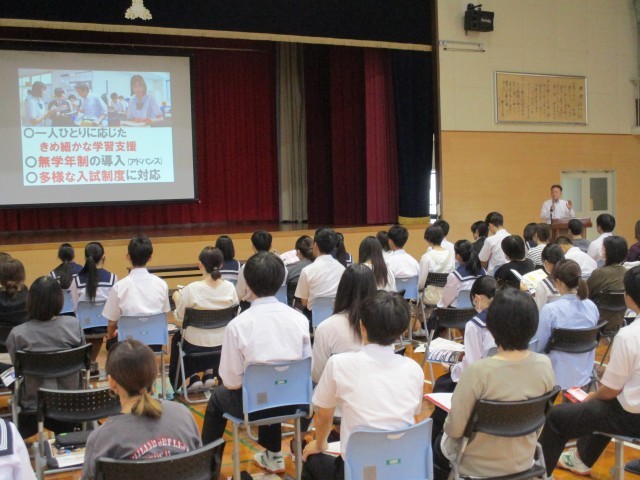 本日、私立高校説明会を開催しました。4つの私立高校からご来校いただき、生徒と保護者の皆様に向けて、それぞれの学校の特色やカリキュラムなどについて詳しくご紹介いただきました。生徒たちは、進路を考えるうえで大切な機会ととらえ、メモを取りながら真剣に耳を傾けていました。