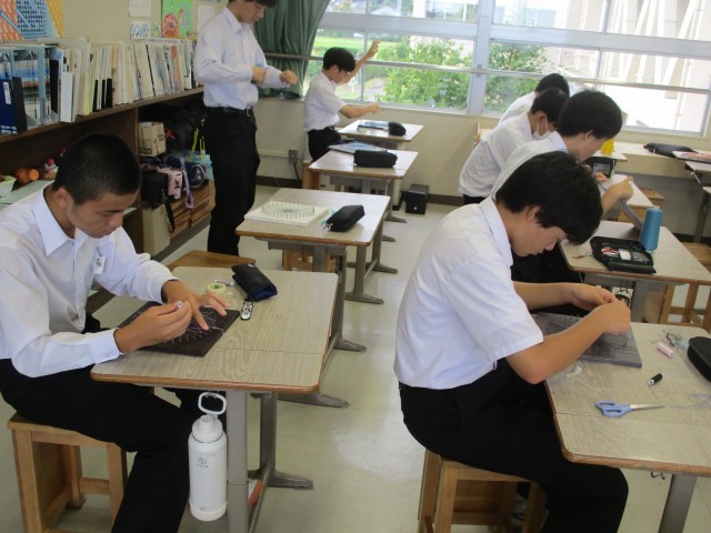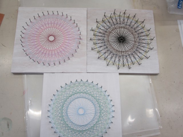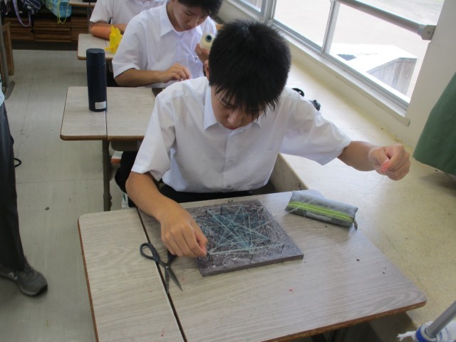 3年生の美術科の授業では、「糸かけアート」に取り組んでいます。釘に糸をかけて模様を作り上げる作品で、いよいよ完成が近づいてきました。生徒たちは、自分の思い描いたイメージに近づけようと、集中して糸をかけていました。完成した作品は、文化祭で展示する予定です。