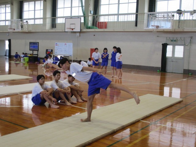 3年生の保健体育科の授業では、マット運動の発表会を行いました。これまでの練習の成果を発揮しようと、一人一人が真剣に演技に取り組みました。緊張の中にもやり切った表情が見られ、成長を感じる発表会となりました。
