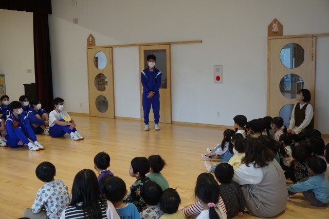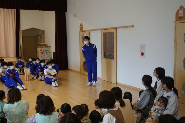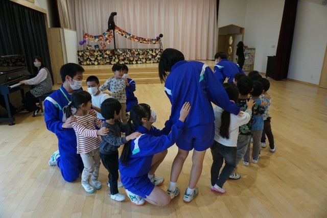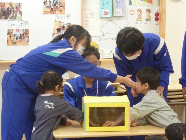 本日、家庭科の学習の一環として、庄東認定こども園さんを訪問しました。事前の学習では、園児の年齢に合わせてグループをつくり、どんな遊びで交流するかを話し合いました。 今日の交流会では、その準備の成果を十分に発揮し、園児の皆さんと笑顔いっぱいの時間を過ごすことができました。