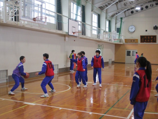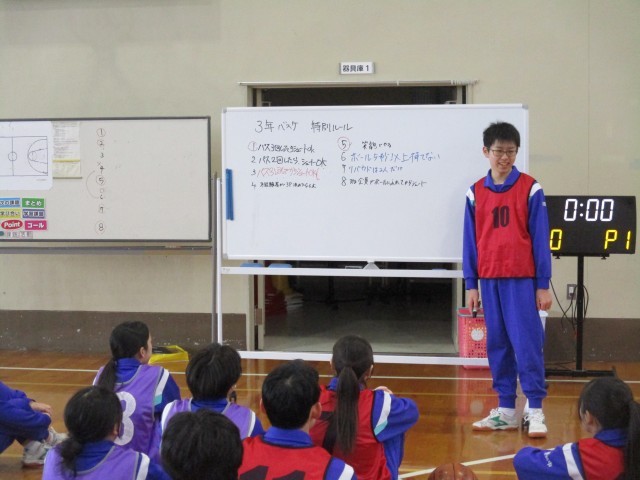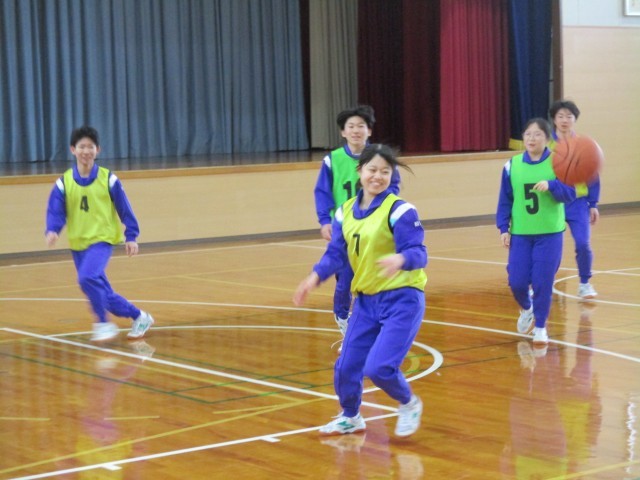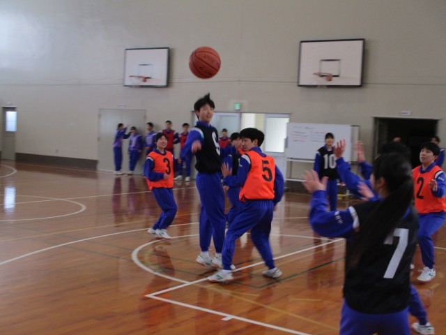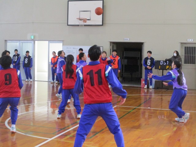 3年生の保健体育科の授業では、バスケットボールに取り組んでいます。今日は、全員が楽しくプレーできるように特別ルールを取り入れて、試合を行いました。生徒たちはルールを意識しながら、声をかけ合い、笑顔でゲームを楽しんでいました。