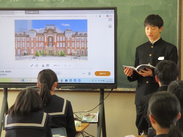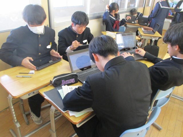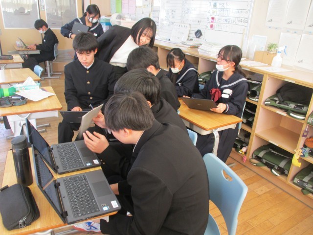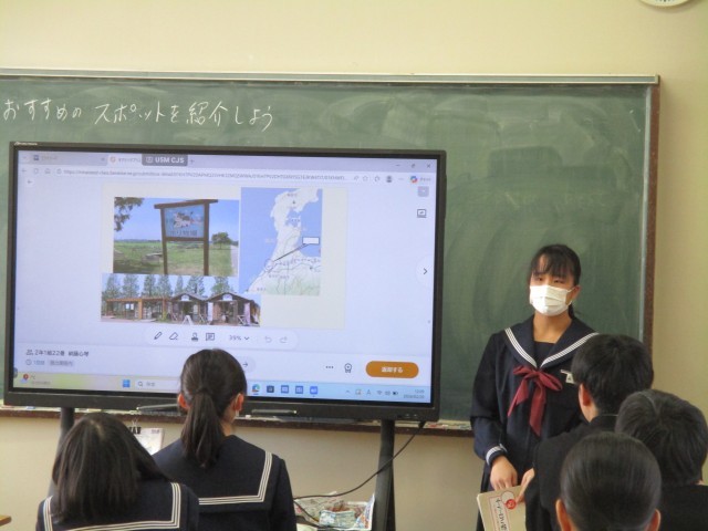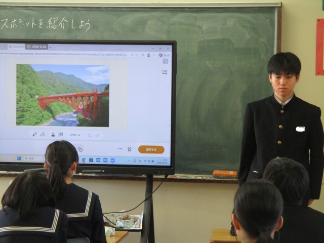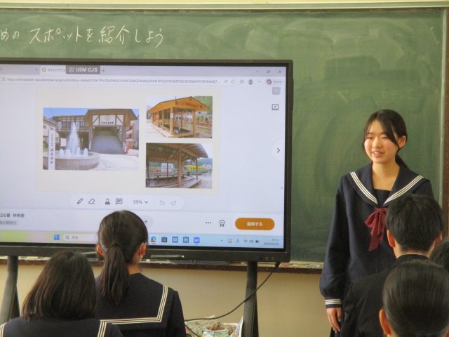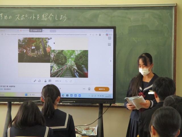 2年生の英語科の授業です。今日は、「ALTにおすすめの場所を紹介しよう」の発表会を行いました。これまで、タブレットで調べて紹介文を作成し、練習を重ねてきました。本日は、その成果を発揮しようと、一人一人が画像を提示しながら、みんなの前で英語によるスピーチに挑戦しました。緊張しながらも、相手に伝わるように、はっきりと話そうとする姿が見られました。