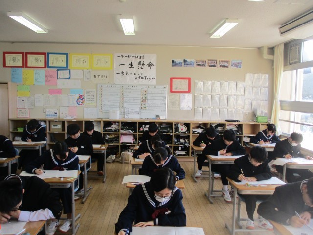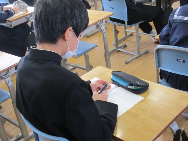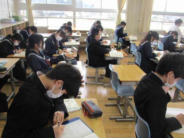 1・2年生の3学期期末考査は2日目を迎えました。昨日の緊張感そのままに、今日も3教科の考査に取り組みました。一問一問に、粘り強く取り組む姿が印象的でした。