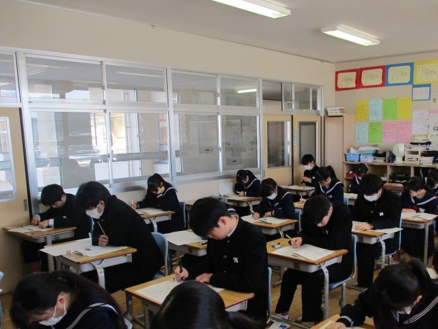 1・2年生の3学期期末考査は、本日最終日を迎えました。3日間の締めくくりとなる今日も、生徒は落ち着いて答案に向き合っていました。一人一人が、自分の力を出し切ろうとする姿が見られました。3学期のまとめとして、次の学年への準備にもつなげていってほしいと思います。