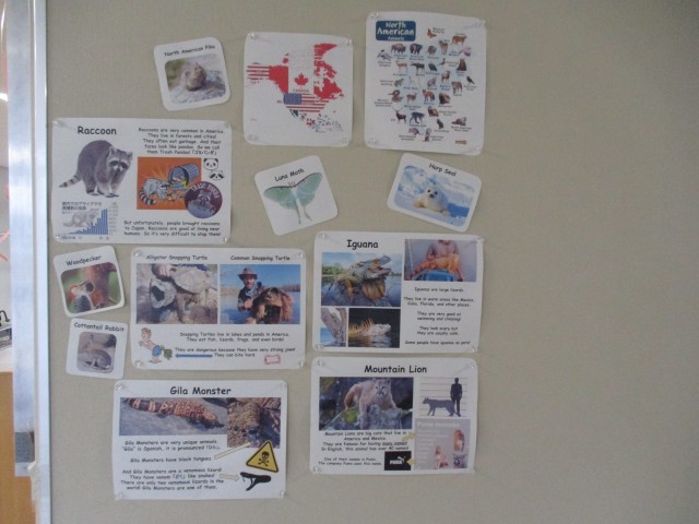 生徒玄関前に掲示しているALTからのメッセージが新しくなりました。今回のテーマは「北アメリカに住む動物」です。日本では見ることのできない動物も紹介されています。