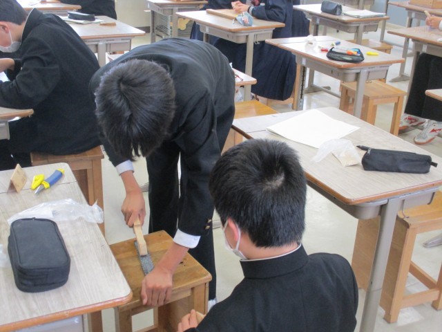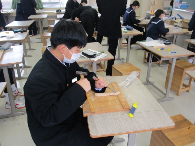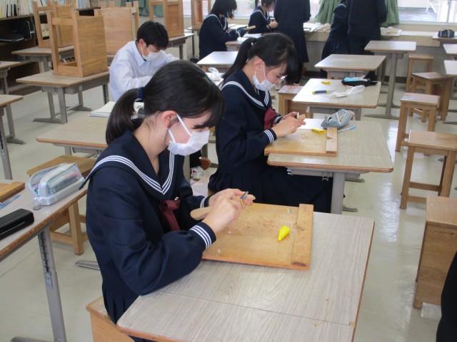 1年生の美術科の授業では、「バターナイフ」の制作が続いています。今日も、のみやカッター、やすりなどを使って、細かな部分を丁寧に削りながら形を整えていきました。大きく形が変わる作業ではありませんが、生徒たちは根気よく取り組んでいました。一つ一つの積み重ねが、完成へとつながっていきます。